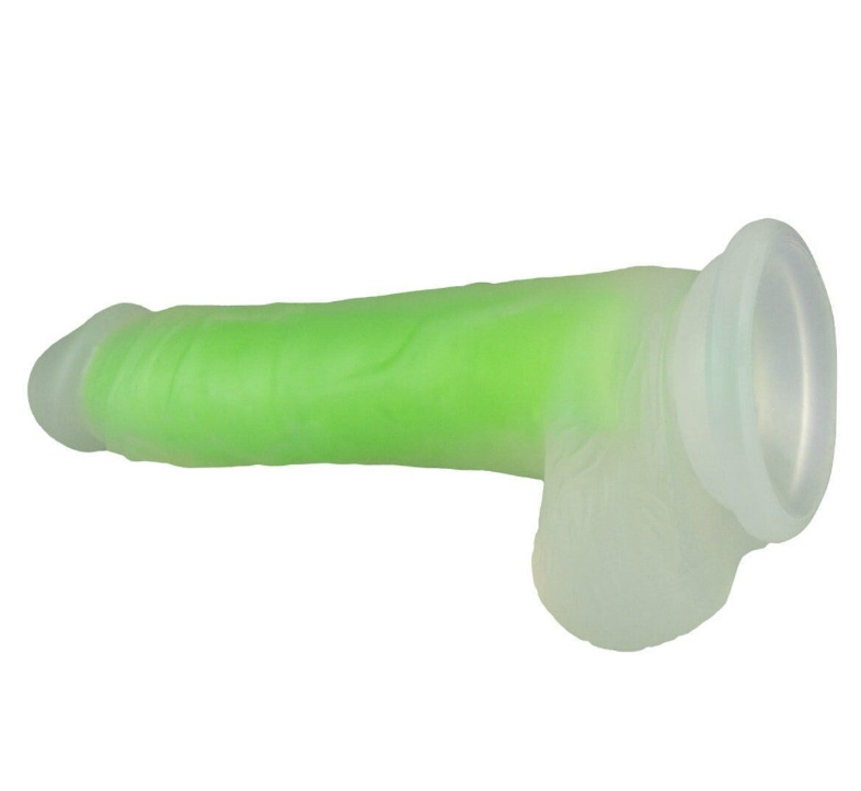 Este consolador combina la forma natural del pene con un efecto luminoso en la oscuridad, lo que lo convierte en un juguete llamativo y único en su clase. Tiene una cabeza pronunciada y un glande realista. Su textura suave y sus testículos redondeados te mimarán con una sensación muy realista en cada empuje. Gracias a su ventosa, se puede fijar a casi todas las superficies lisas y, por lo tanto, también proporciona una diversión intensa sin necesidad de usar las manos, como en la ducha. Debido a su amplia base, también se puede fijar a un arnés con correa para una fiesta UV. El consolador está fabricado con un material higiénico y fácil de cuidar, por lo que es fácil de limpiar.